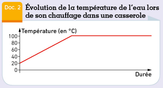 La température reste constante durant l'ébullition, ce qui est confirmé par le graphique du document 2. Il est donc inutile de forcer le chauffage, l'eau ne deviendra pas plus chaude et les pâtes ne cuiront pas plus vite. (Par contre l'eau pourrait s'évaporer plus vite et il pourrait manquer d'eau liquide avant la fin de la cuisson des pâtes).