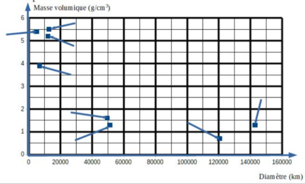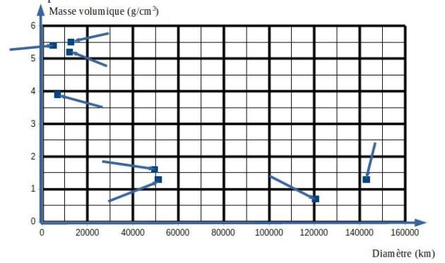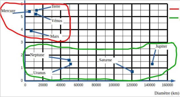 6) 4 planètes appartiennent à la famille des planètes gazeuses et 4 à la famille des planètes telluriques. Indique sur le graphique la légende des couleurs choisies pour entourer les groupes de planètes en attribuant leurs noms aux deux familles de planètes.