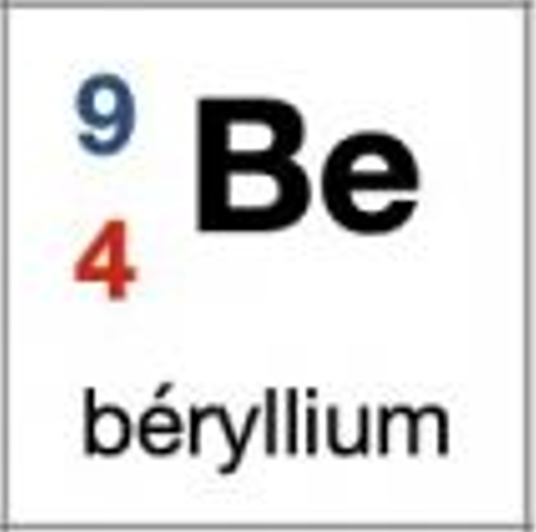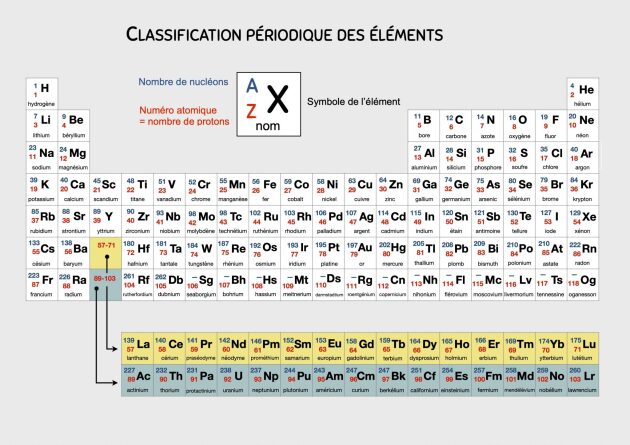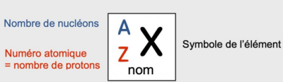 Exemple : sur la classification périodique des éléments, on lit que l'élément de symbole F est le Fluor et que son noyau comporte 9 protons.